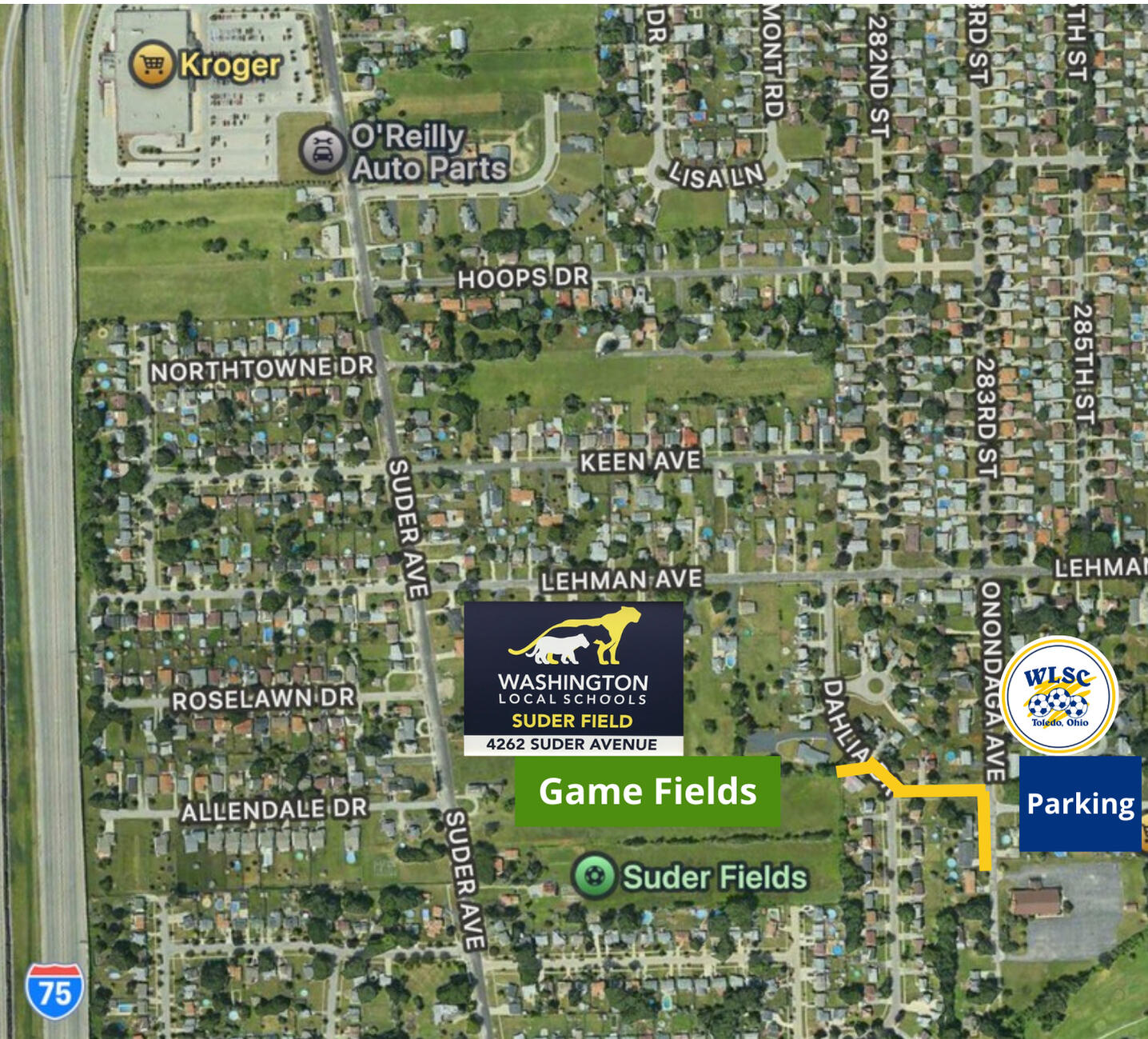 In the summer of 2024, we were tasked with finding yet another location to continue playing soccer. We were able to move just a couple of miles down the street from where it all began in 1999 at Shoreland.We are excited that we found a new home and can continue providing recreational soccer for the Washington Local community. We now play our games at Suder Field, which is located at 4262 Suder Avenue in Toledo.